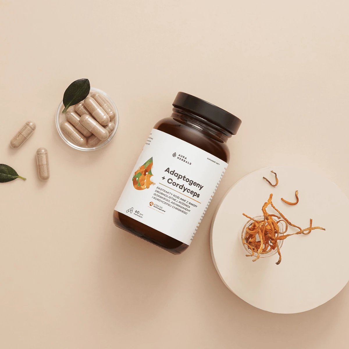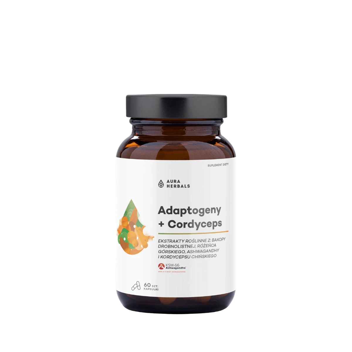 Adaptogeny + Cordyceps - Ashwagandha KSM-66 Bakopa Różeniec (60 kaps) Aura Herbals