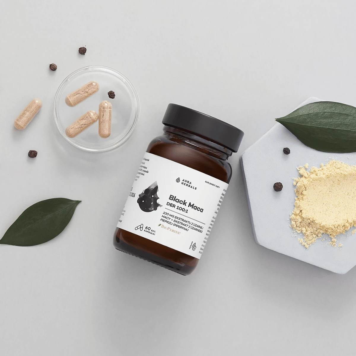 Suplement diety Aura Herbals Black Maca to wysoce skoncentrowany preparat zawierający ekstrakt z korzenia czarnej macy o rzadko spotykanym współczynniku DER 100:1 oraz markowy ekstrakt z czarnego pieprzu BioPerine®. Czarna maca jest najrzadszą odmianą tej rośliny, cenioną za swoje unikalne właściwości adaptogenne i wzmacniające organizm.