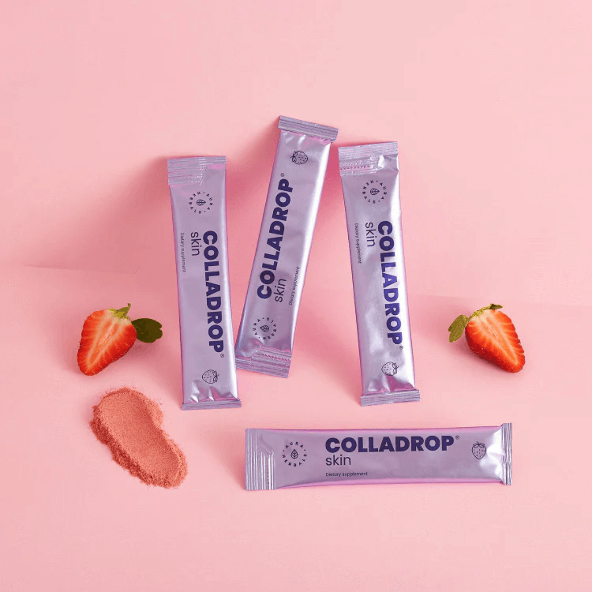 Suplement diety Colladrop SKIN w saszetkach to preparat zawierający 5000 mg hydrolizowanego kolagenu wolowego typu I i III, wzbogaconego o składniki aktywne takie jak witamina C, koenzym Q10, kwas hialuronowy oraz biotyna.