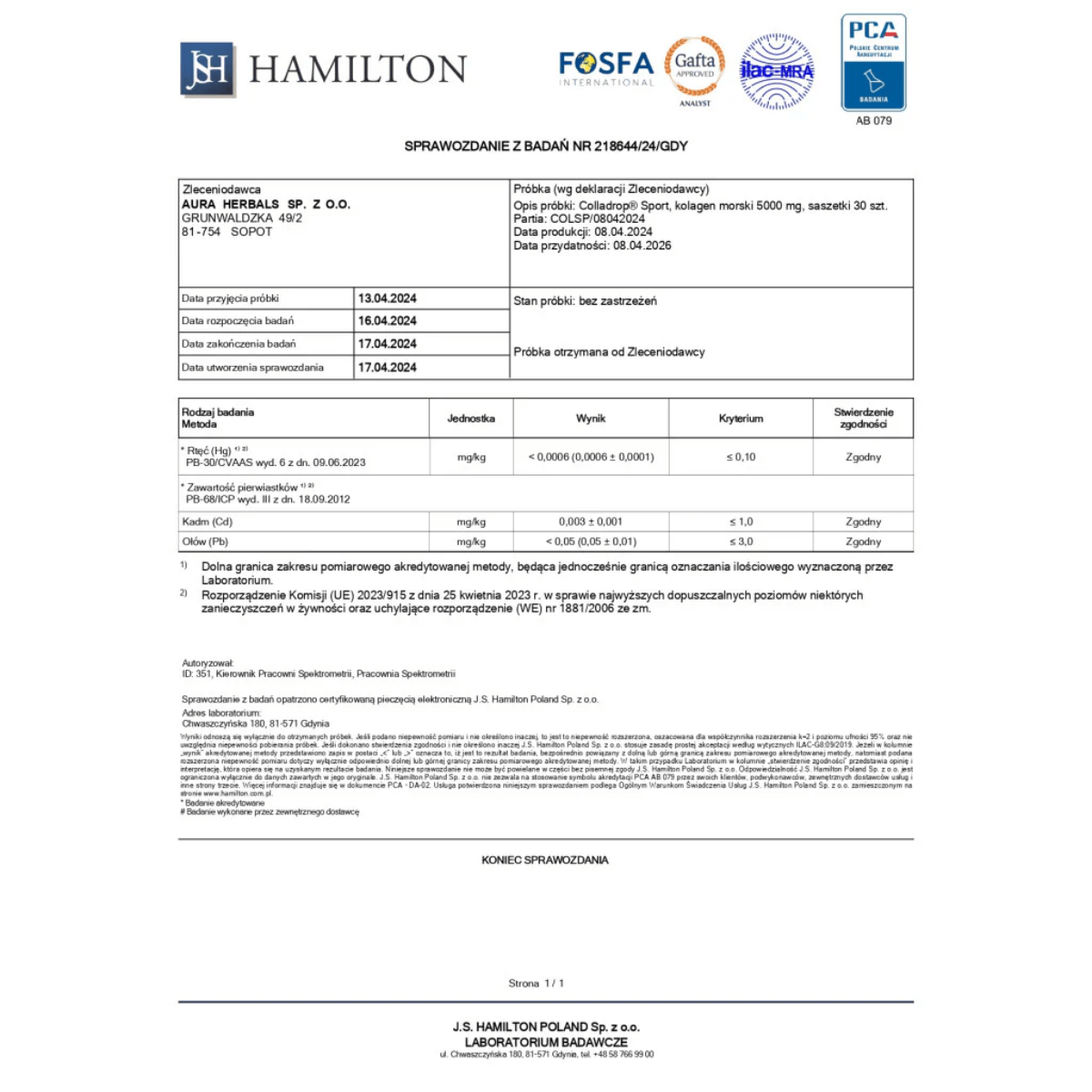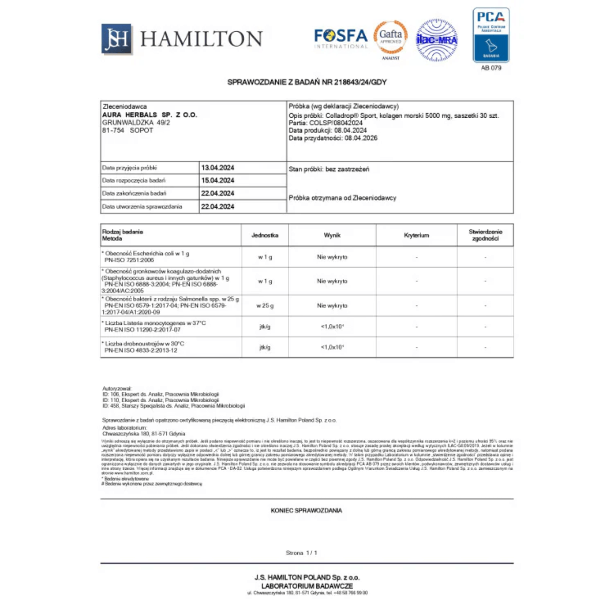 Produkt został przebadany w niezależnej jednostce laboratoryjnej w celu zagwarantowania najwyższej jakości i bezpieczeństwa stosowania suplementu diety.