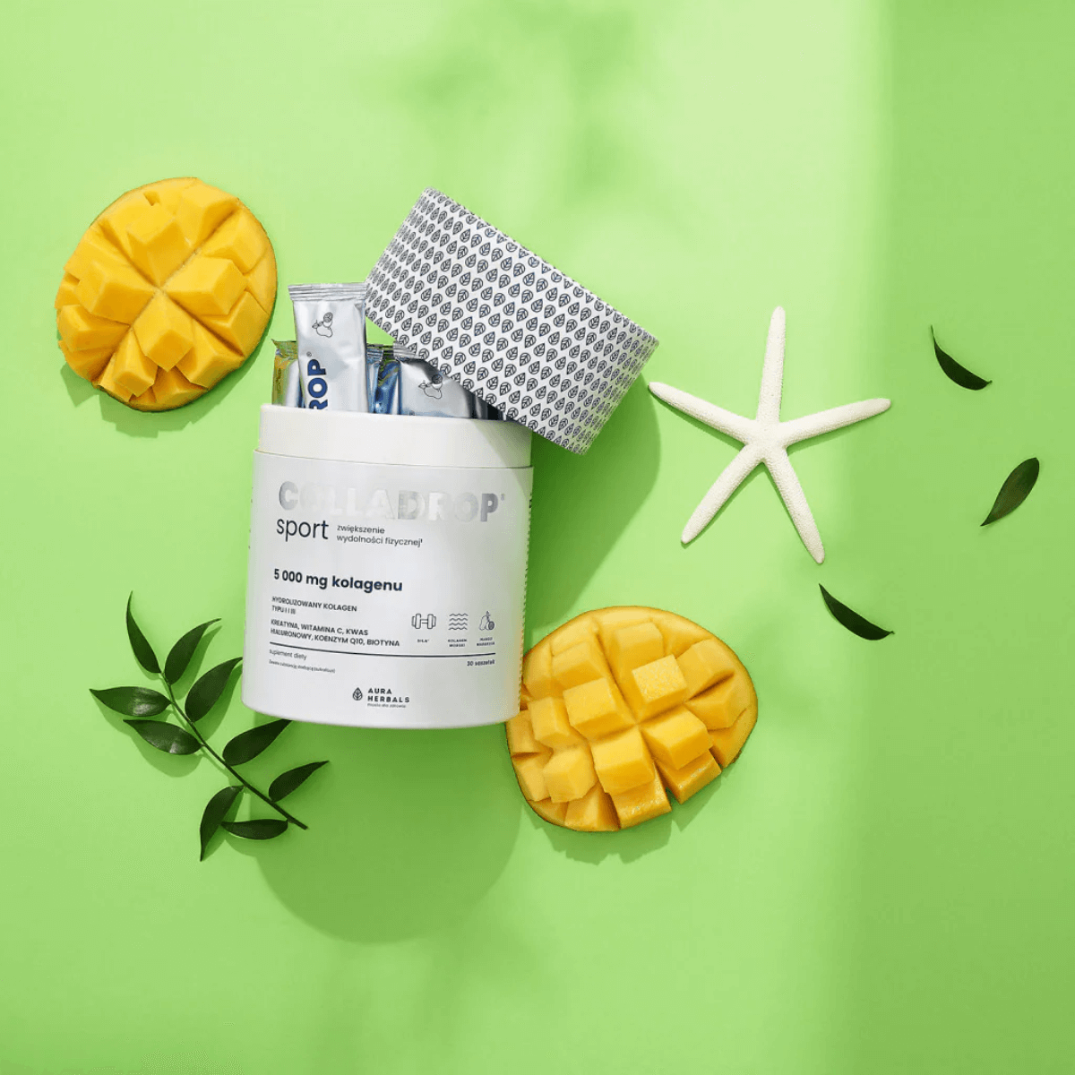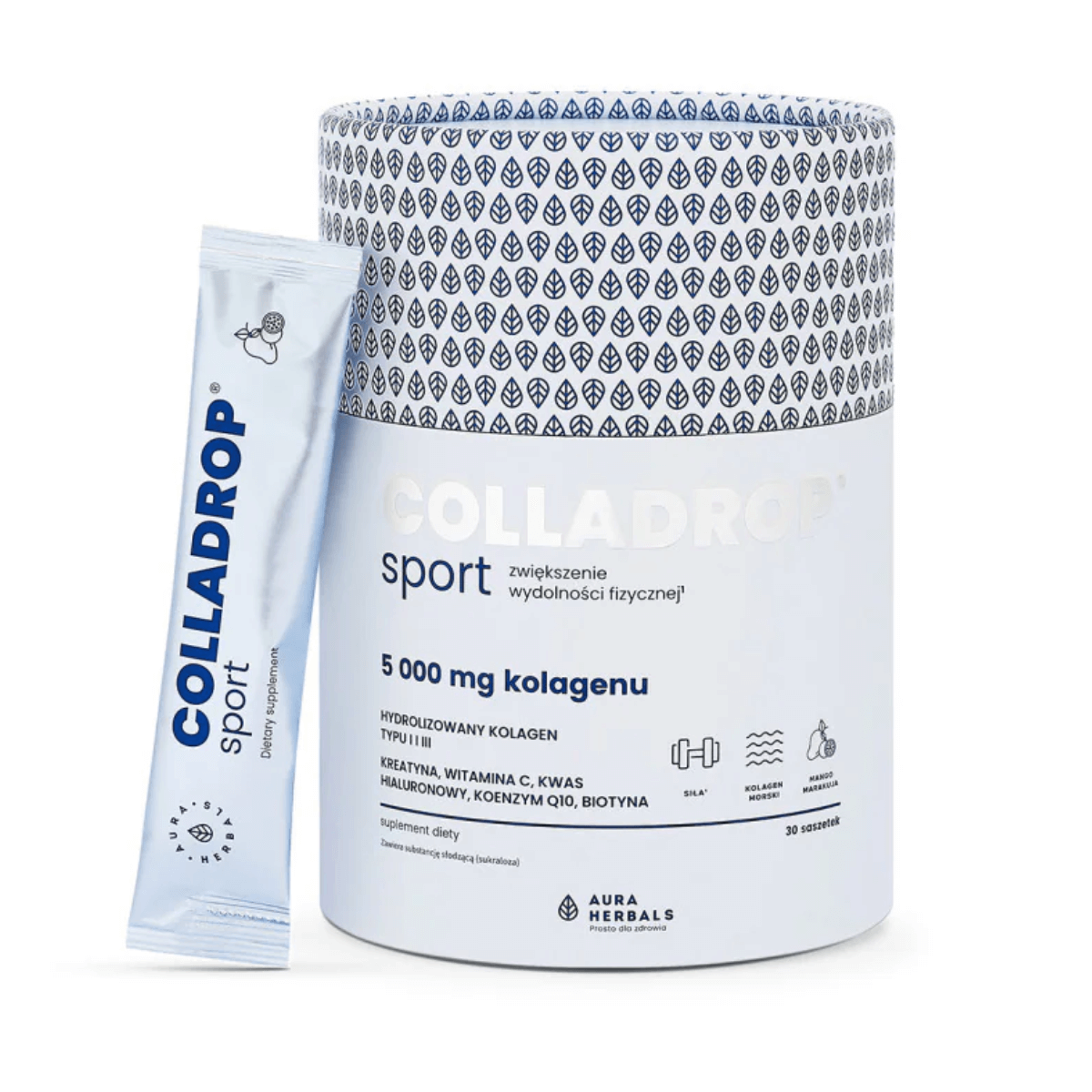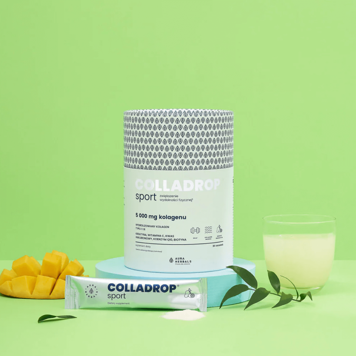 Colladrop SPORT Hydrolizowany Kolagen Morski 5000 mg Typu I i III - Mango i Marakuja (30 sasz) Aura Herbals (OUTLET)