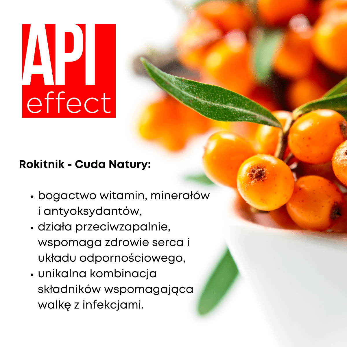 Rośliny rokitnika - zawierają wiele składników odżywczych, w tym witaminy, minerały, antyoksydanty i kwasy tłuszczowe omega-3, omega-6 i omega-9. Działanie rokitnika na organizm może być korzystne dla zdrowia z uwagi na jego właściwości przeciwzapalne, przeciwbakteryjne, przeciwwirusowe i wzmacniające odporność. Może wspomagać funkcjonowanie układu odpornościowego, układu sercowo - naczyniowego, a także pielęgnację skóry.