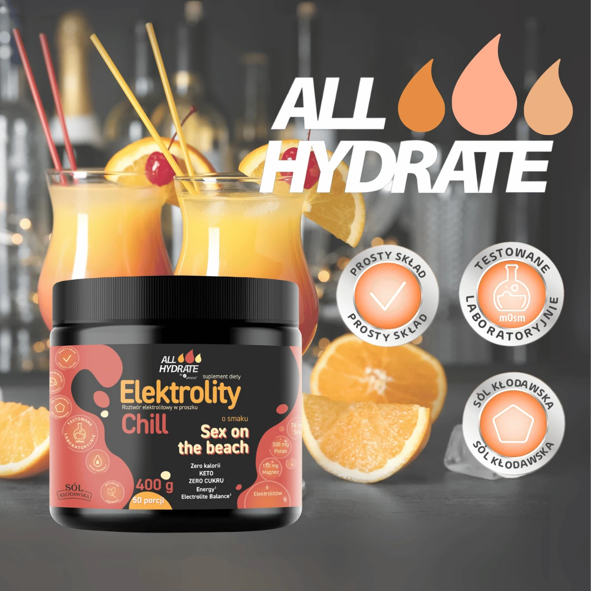 ALLHydrate Chill Sex On The Beach to hipotoniczny suplement elektrolitowy. Wysokiej jakości składniki wspierają nawodnienie i równowagę elektrolitową organizmu, zwłaszcza podczas aktywności fizycznej, ale także w stanie zwiększonego zapotrzebowania na pierwiastki aktywne.