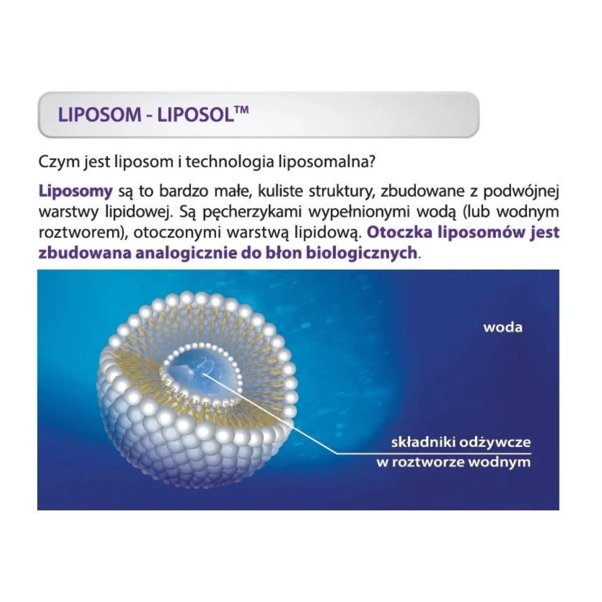 Produkt LiposolTM Premium Absorption Technology w postaci liposomalnej to światowa innowacja o niezwykle skutecznym efekcie odżywczym w zakresie suplementacji, potwierdzonym szeregiem badań laboratoryjnych i klinicznych. Liposomy LiposolTM są bezpieczne dla zdrowia i wykazują wysoką biodostępność. Wszystkie użyte składniki są wnikliwie dobrane, posiadają szereg badań i pochodzą wyłącznie od certyfikowanych dostawców.