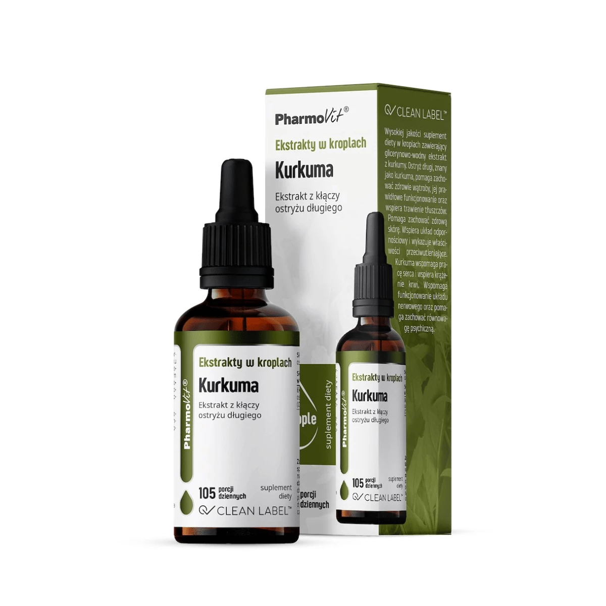 Dzięki płynnej formie kropli suplementacja Ekstrakt Kurkuma 30 ml Pharmovit jest wygodna i precyzyjna – wystarczy odmierzyć zalecaną ilość i popić wodą.