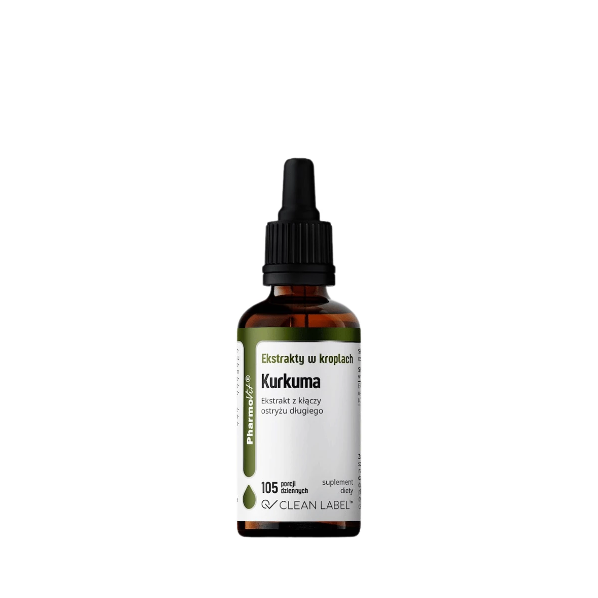 Wysokiej jakości suplement diety w formie kropli, zawierający glicerynowo-wodny ekstrakt z kłączy ostryżu długiego (Curcuma longa).