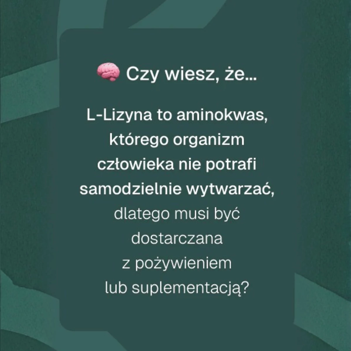 L-Lizyna jest aminokwasem egzogennym (niezbędnym). Oznacza to, że organizm nie potrafi jej samodzielnie syntetyzować,, dlatego musi być ona dostarczana wraz z pożywieniem lub w formie odpowiedniej suplementacji. Jest ona kluczowym elementem budulcowym wielu białek w ludzkim organizmie.