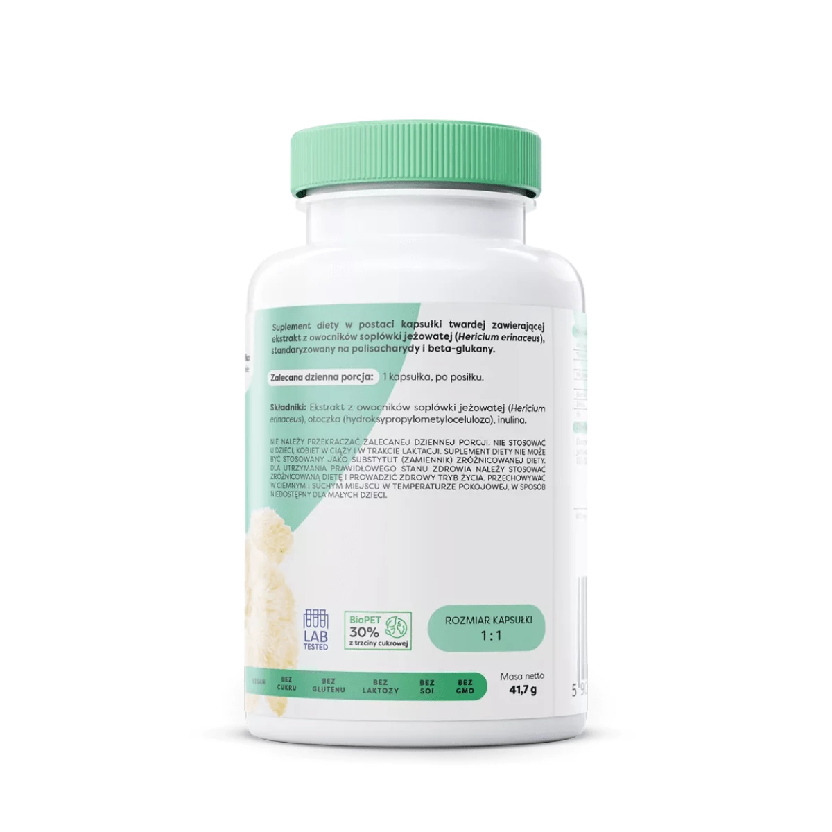 Ekstrakt z owocników soplówki jeżowatej (Hericium erinaceus), otoczka (hydroksypropylometyloceluloza), inulina. (600 mg ekstraktu otrzymano z 18 g owocników soplówki jeżowatej).
