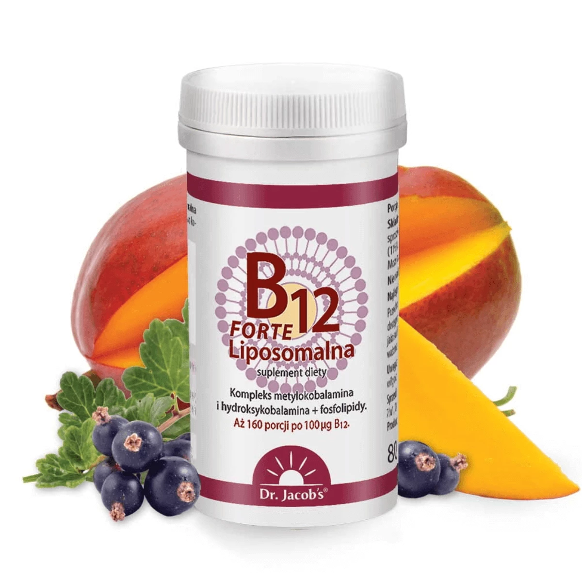 LIPOSOMALNA WITAMINA B12 FORTE KOMPLEKS HYDROKSY- I METYLOKOBALAMINA + FOSFOLIPIDY SMAK MANGO I CZARNA PORZECZKA VEGE PROSZEK PODJĘZYKOWY 80 g DR. JACOB'S - SUPLEMENT DIETY