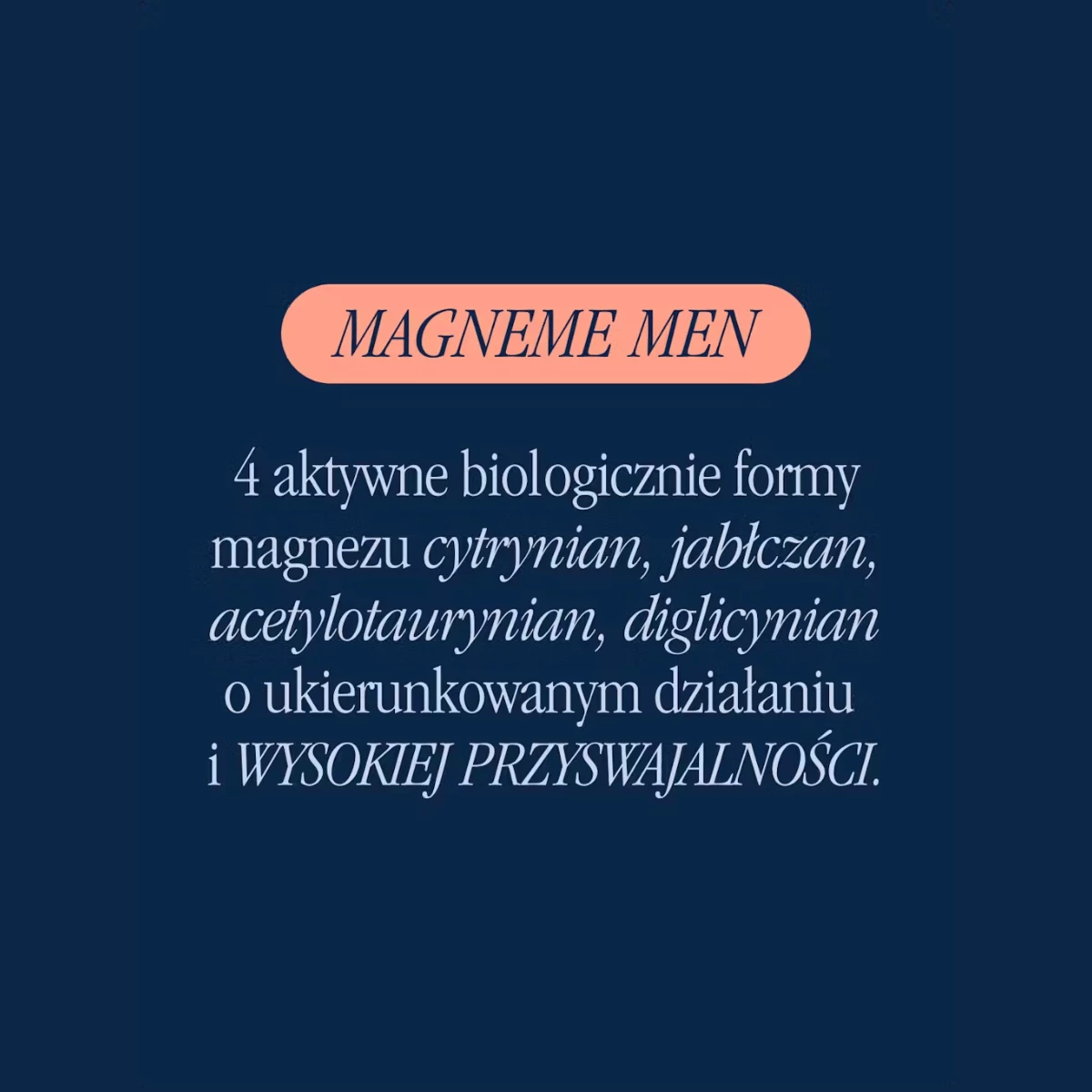 MagneMe Men to połączenie 4 aktywnych biologicznie form magnezu w wysokiej dawce oraz przyswajalności, aby wspierać prawidłowe działanie układu nerwowego i odpornościowego mężczyzn przez całą dobę.