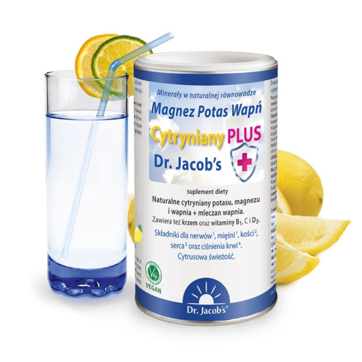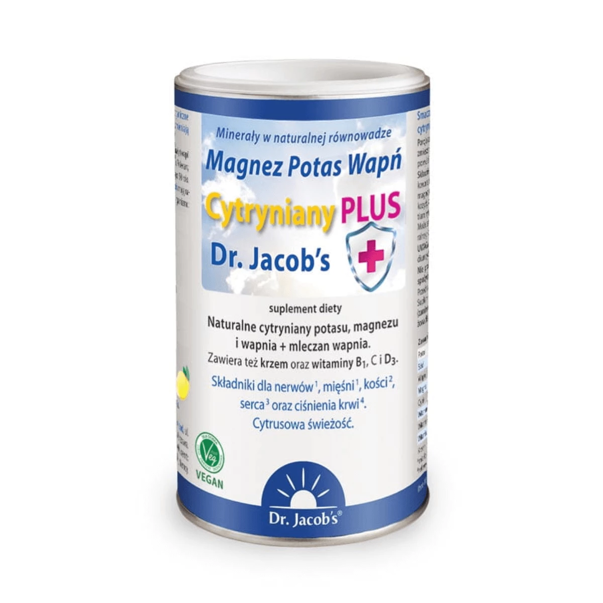 CYTRYNIANY PLUS MAGNEZ POTAS WAPŃ MINERAŁY W NATURALNEJ RÓWNOWADZE NATURALNY SMAK CYTRYNOWY VEGE PROSZEK 300 g DR. JACOB'S - SUPLEMENT DIETY