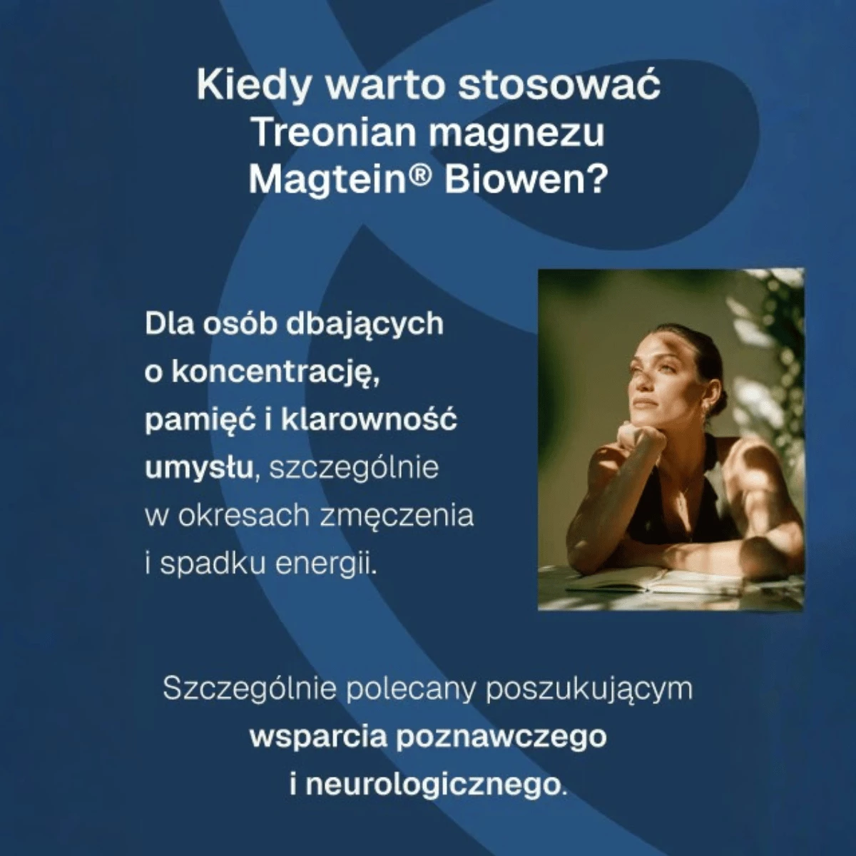 Treonian magnezu Magtein® Biowen to przełomowa formuła opracowana z myślą o maksymalnym wsparciu układu nerwowego i funkcji poznawczych. Jako jedyna forma magnezu skutecznie przekracza barierę krew-mózg, docierając bezpośrednio tam, gdzie jest najbardziej potrzebny dla umysłu.
