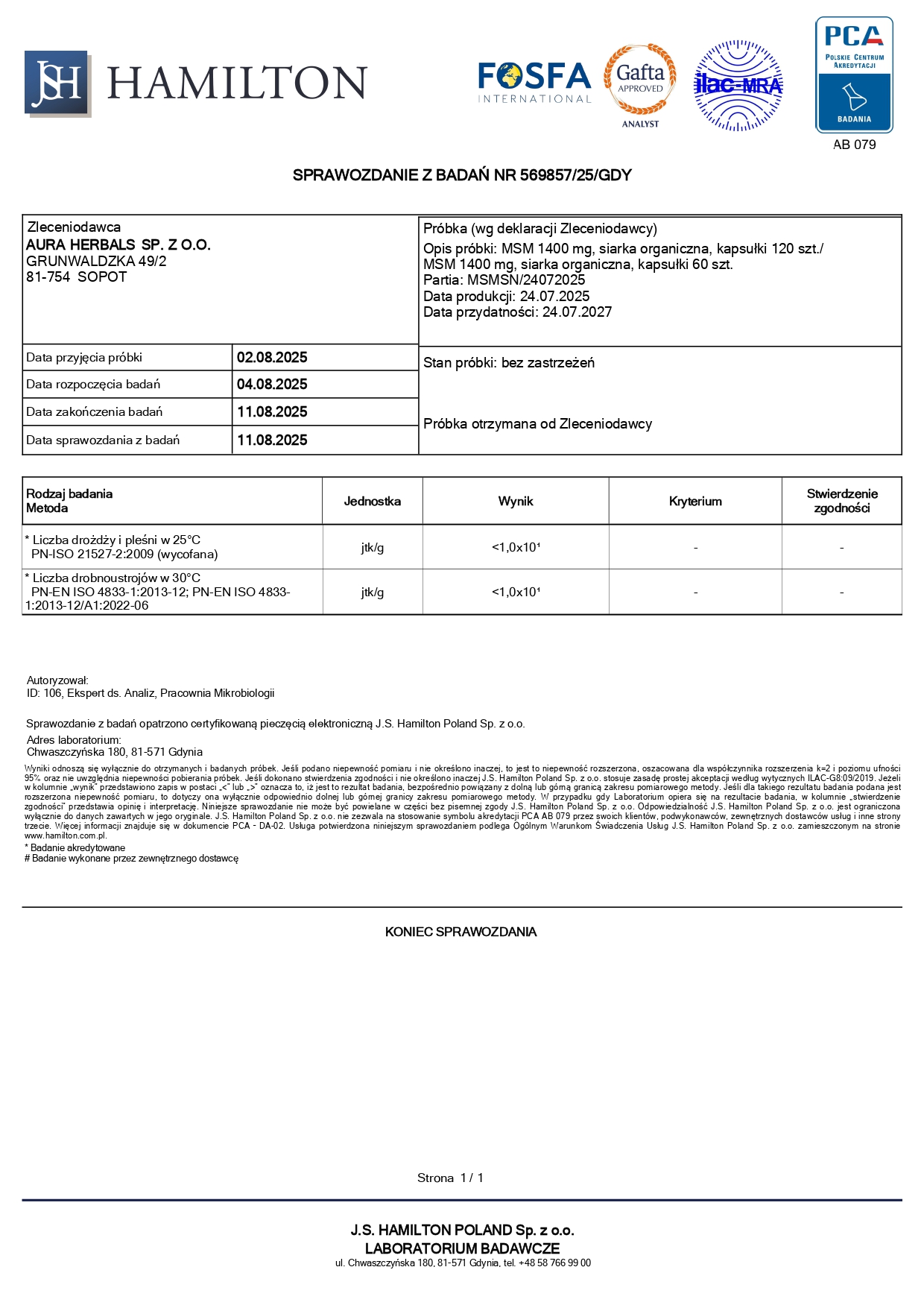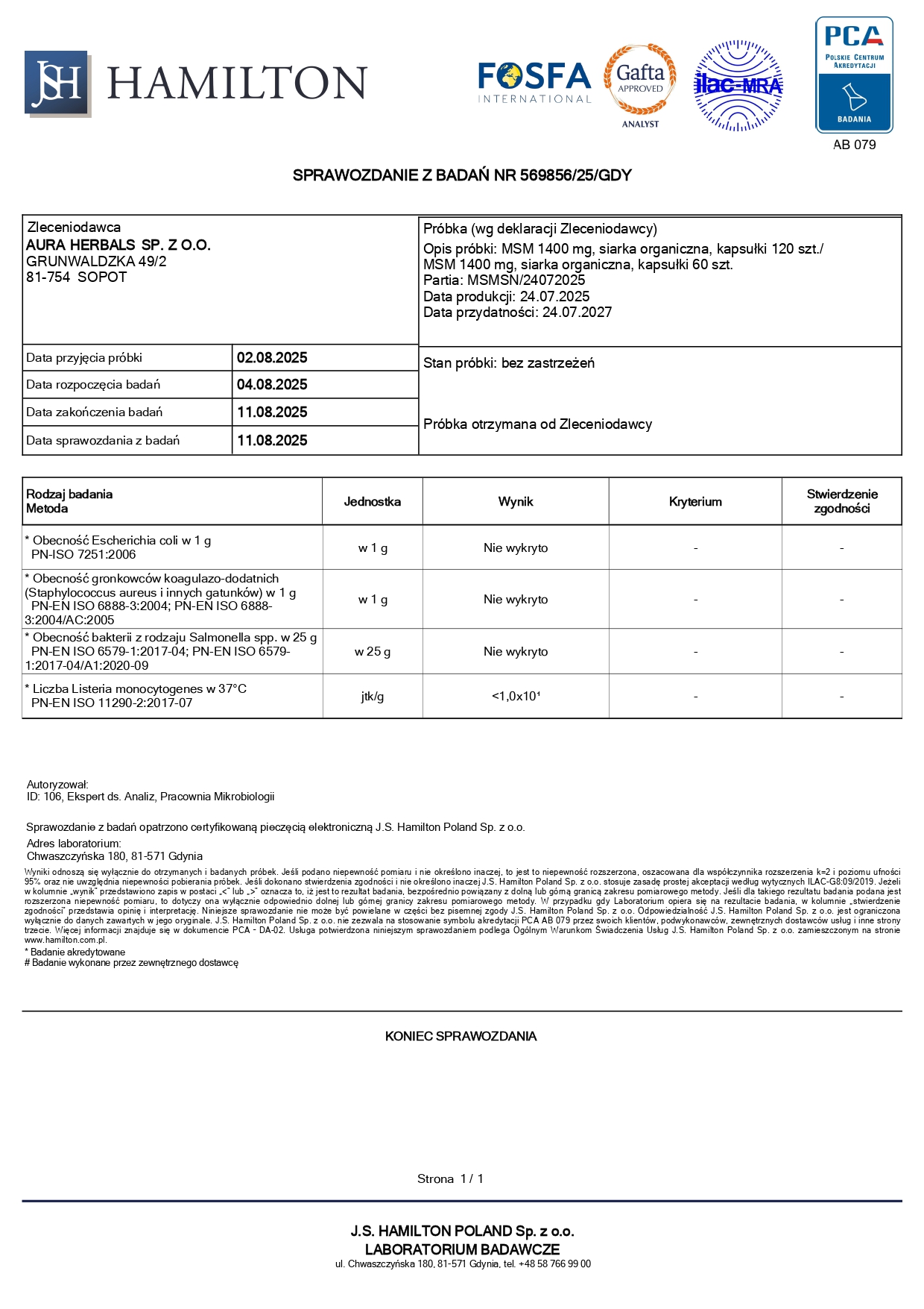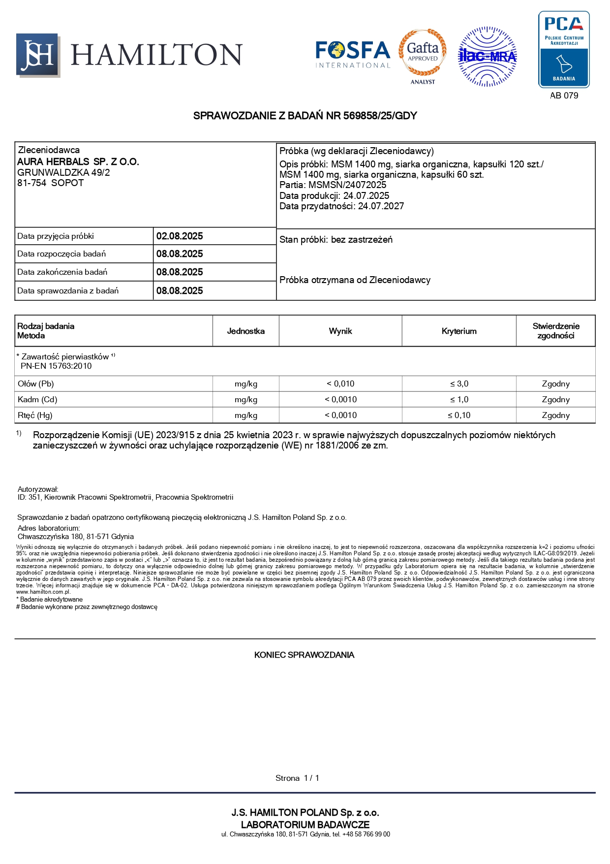 Suplement jest przebadany w niezależnej jednostce laboratoryjnej J.S. Hamilton, w celu zagwarantowania najwyższej jakości i bezpieczeństwa stosowania produktu. Badania potwierdziły - brak zanieczyszczeń mikrobiologicznych oraz zanieczyszczeń metalami ciężkimi.