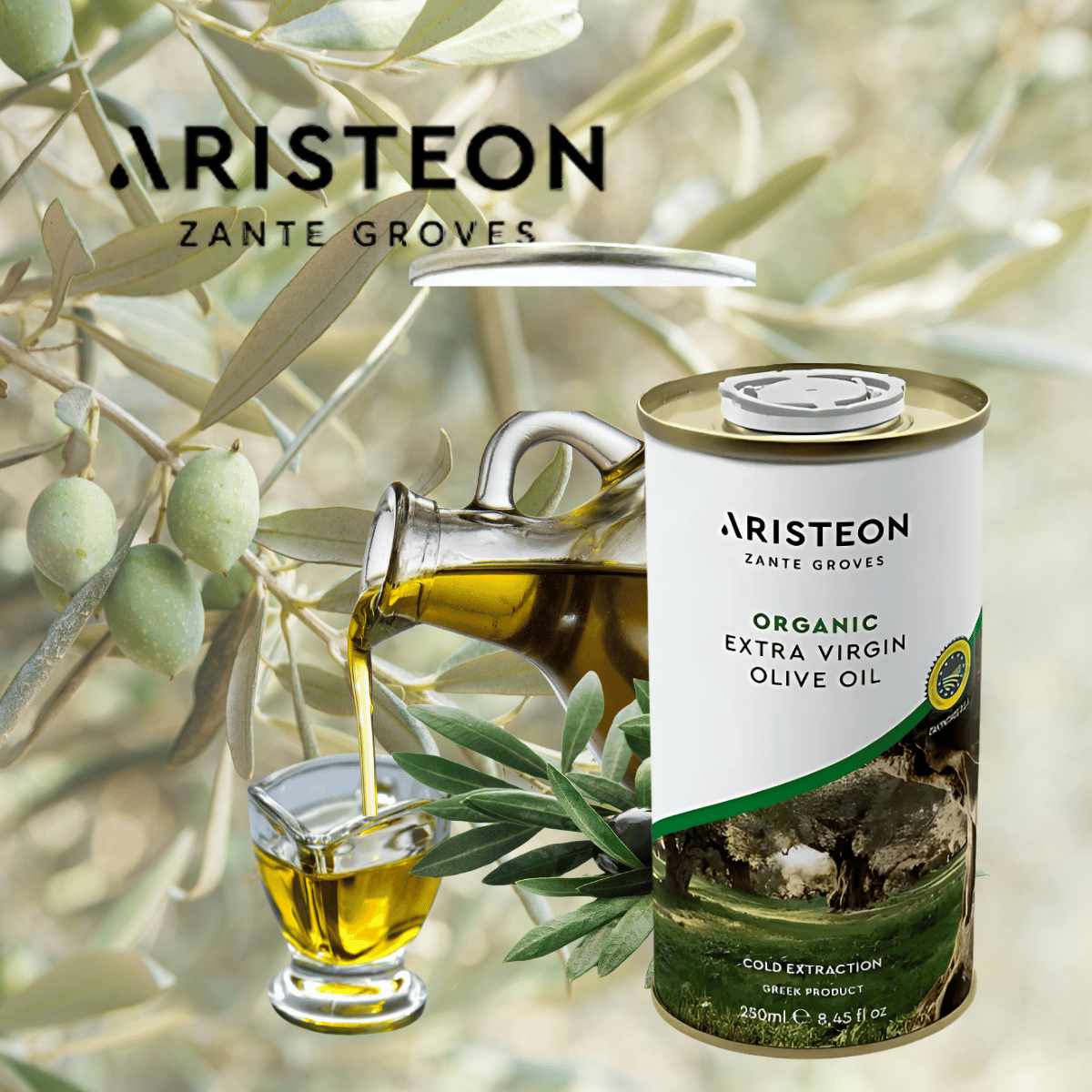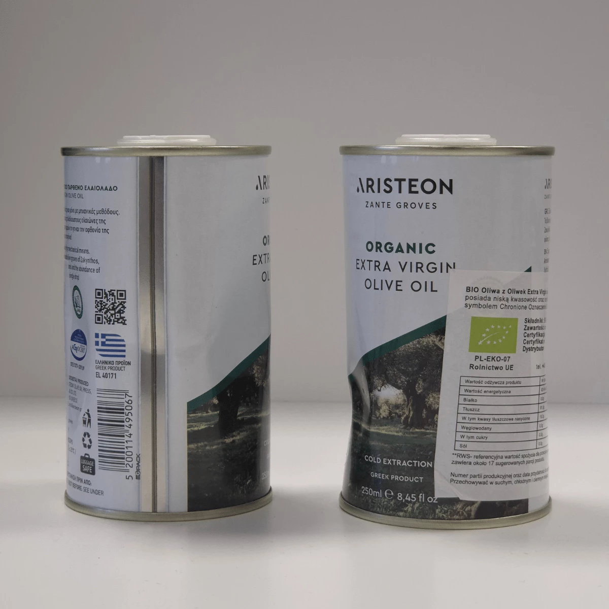 Oliwa o niskiej kwasowości, zamknięta w metalowym opakowaniu, oznaczona symbolem Chronione Oznaczenie Geograficzne Zakynthos (ChOG) i certyfikatem ekologicznym.