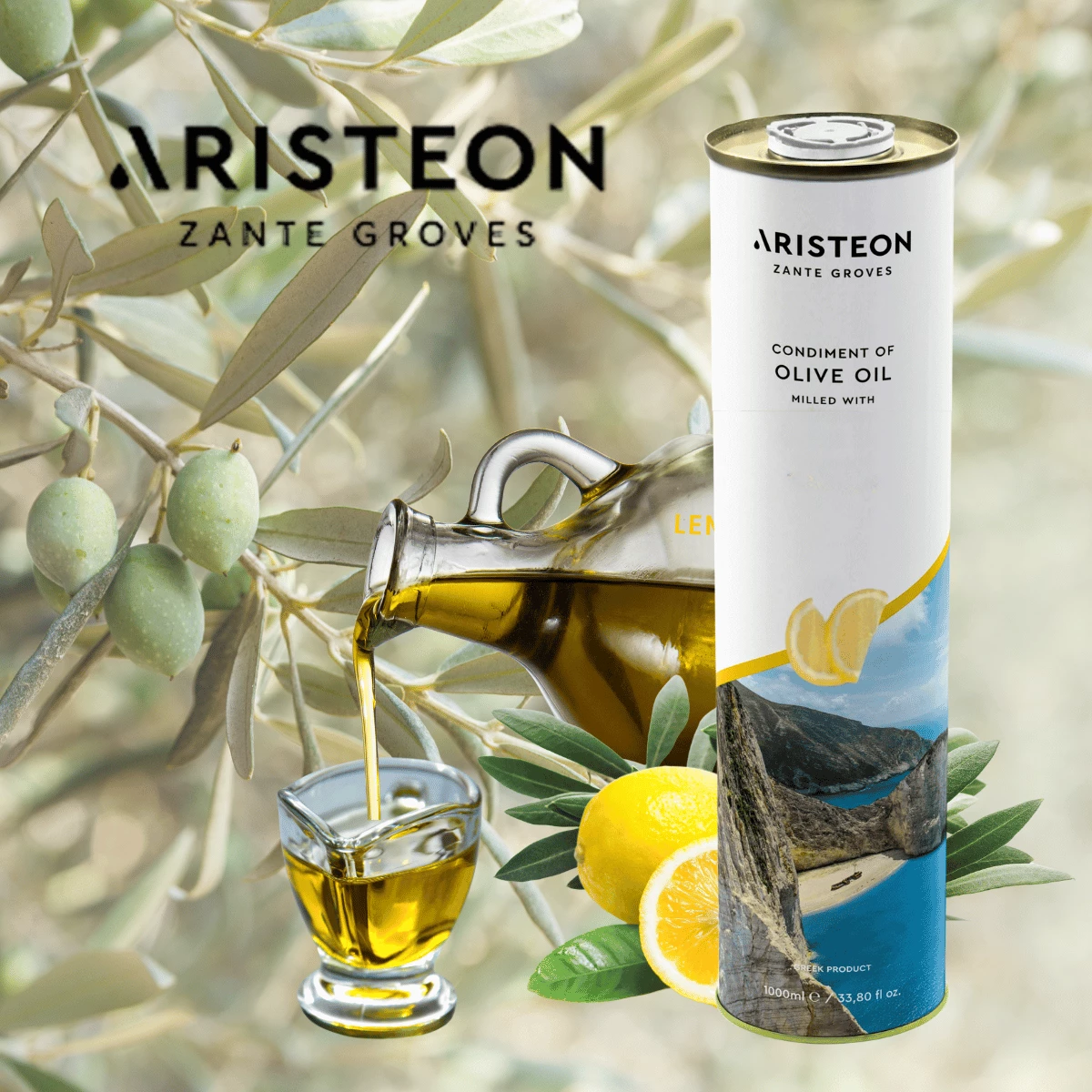 Oliwa ze świeżo wyciśniętym sokiem z cytryny, zamknięta w metalowym opakowaniu, oznaczona symbolem Chronione Oznaczenie Geograficzne Zakynthos (ChOG). Idealny dodatek do sałatek, grillowanej ryby i mięsa.