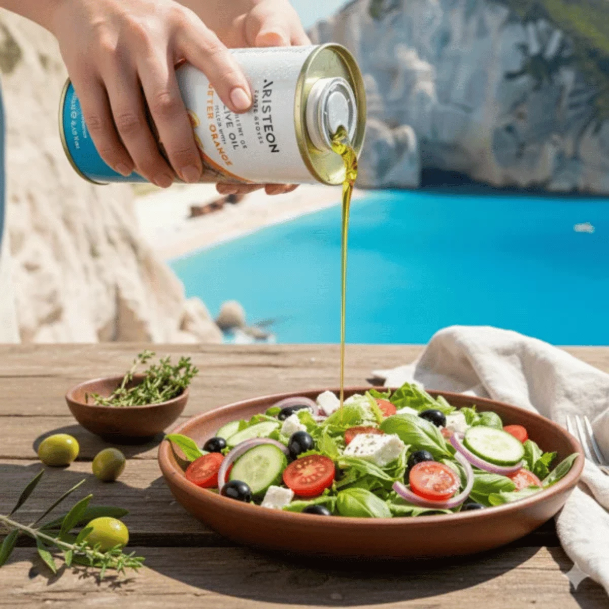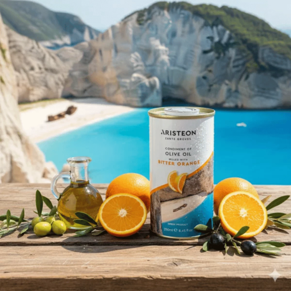 Oliwa ze świeżo wyciśniętym sokiem z gorzkiej pomarańczy, zamknięta w metalowym opakowaniu, oznaczona symbolem Chronione Oznaczenie Geograficzne Zakynthos (ChOG). Idealny dodatek do sałatek, marynat do mięsa, ciast i biszkoptów.