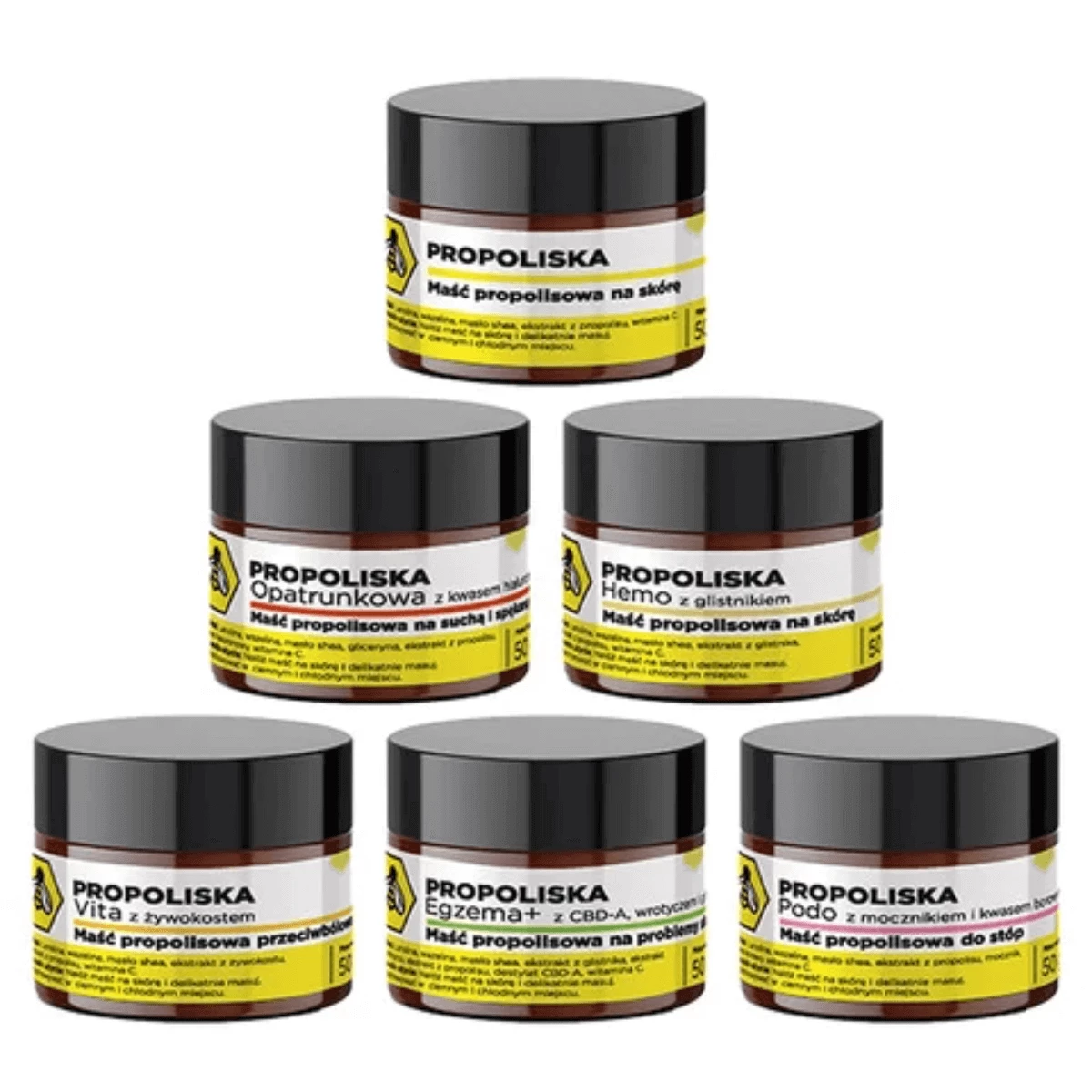 Produkty te wzbogacone są wyciągami z ziół, takimi jak glistnik, wrotycz, konopia, rokitnik, piołun, kozieradka oraz substancjami aktywnymi jak kwas hialuronowy, mocznik, kwas borowy, witamina C, które w synergii z propolisem działają jeszcze bardziej efektywnie.