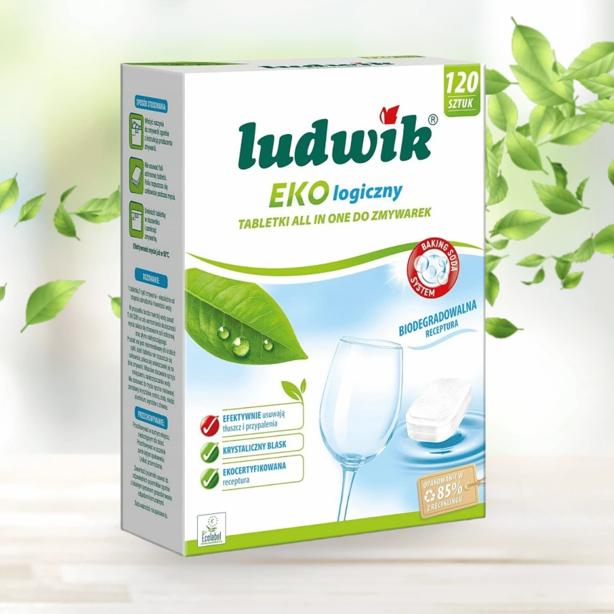 Ekologiczne tabletki Ludwik do zmywarek All in One to tabletki, w których wszystkie składniki posiadają innowacyjną formułę, która łączy skuteczność zmywania z troską o środowisko naturalne.
