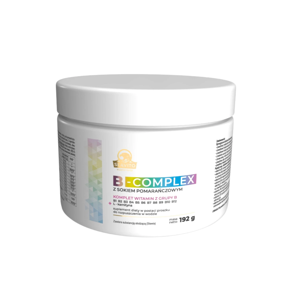 Witamina B-COMPLEX Slavito w proszku 192 g z sokiem pomarańczowym to suplement, który przyczynia się do utrzymania prawidłowych funkcji wielu układów w organizmie. Witaminy B są bardzo ważne, ponieważ wspierają prawidłową pracę całego organizmu. Suplement został wzbogacony o pomarańczy smak.