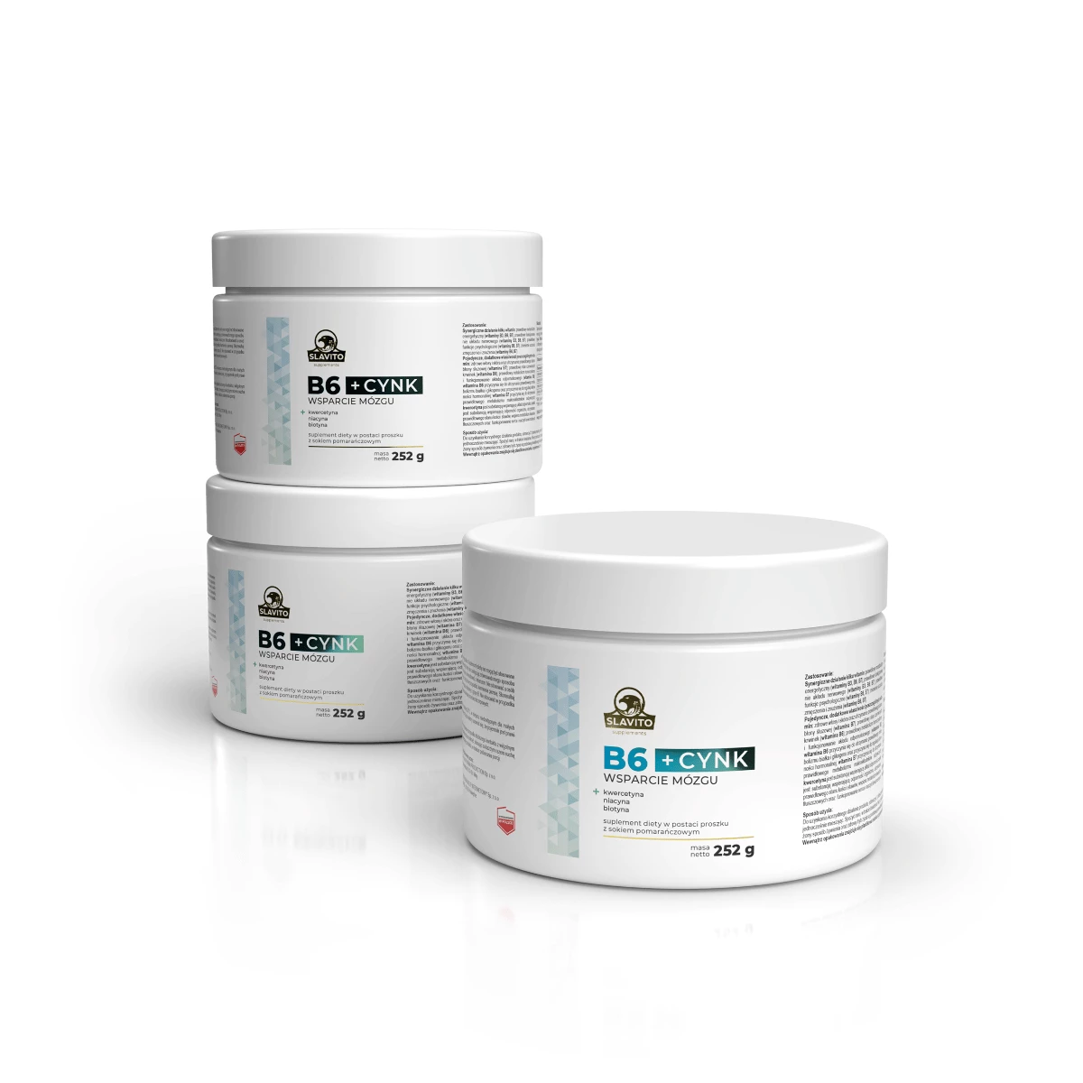 WITAMINA B6 + CYNK Slavito w proszku to suplement diety zawierający witaminę B3, B6 i B7 z cynkiem, wzbogacony o kwercetynę z ekstraktu z perełkowca japońskiego. Suplement ma wspierać pracę mózgu i ogólna sprawność układu nerwowego.