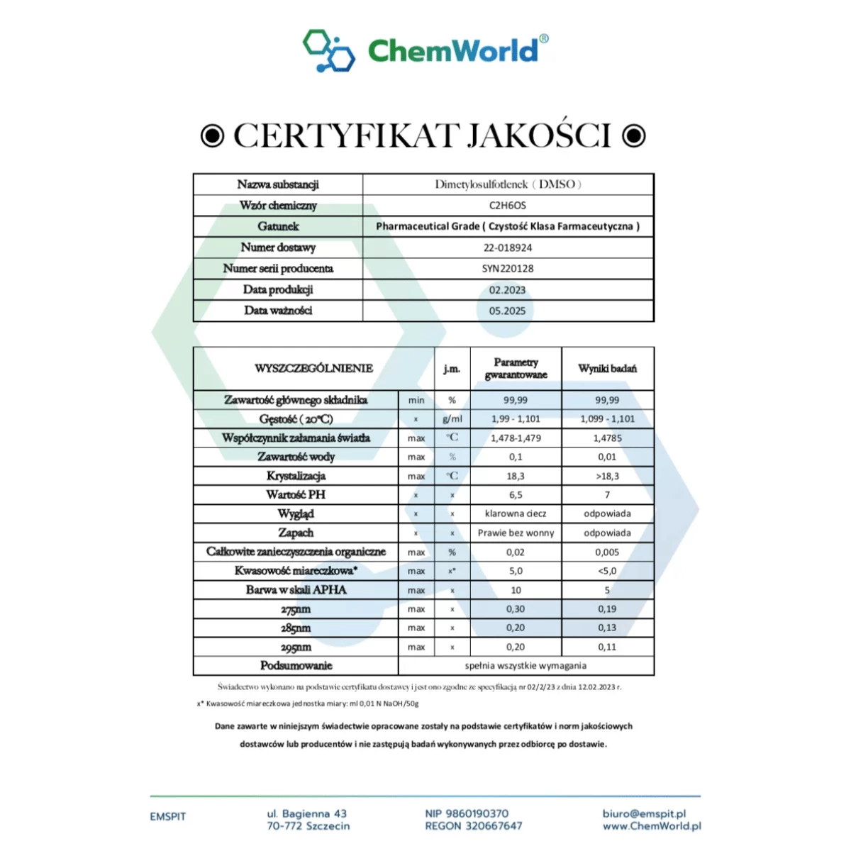 | Czystość | Czystość Farmaceutyczna DMSO 99,99% - PRZEBADANA LABORATORYJNIE |